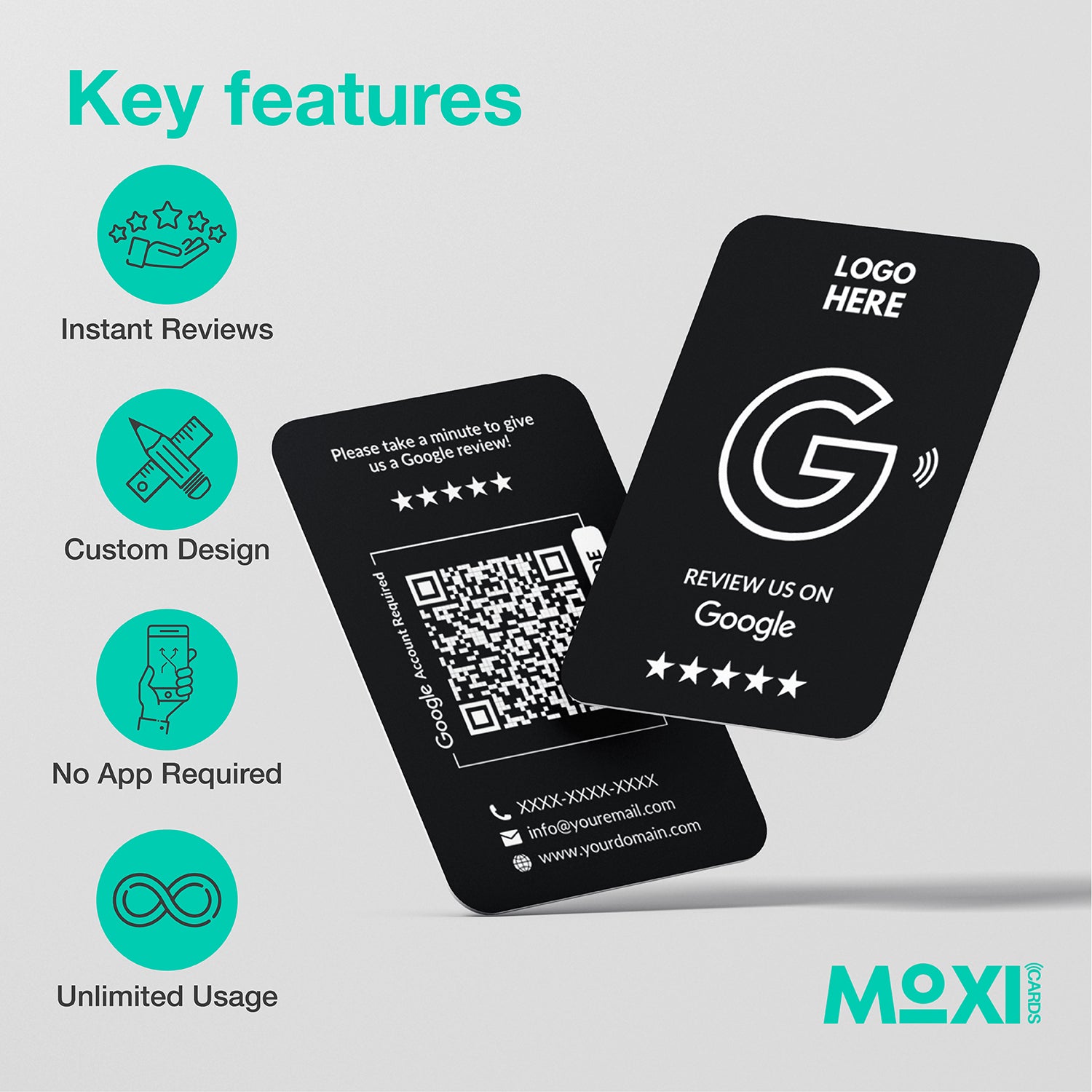 Boost your business with Moxicards! Our NFC and QR review cards make it quick and easy for customers to leave a Google review. Just tap or scan, and they’ll be taken straight to your Google review page – helping you gain more 5-star reviews, build your reputation, and improve your local SEO.